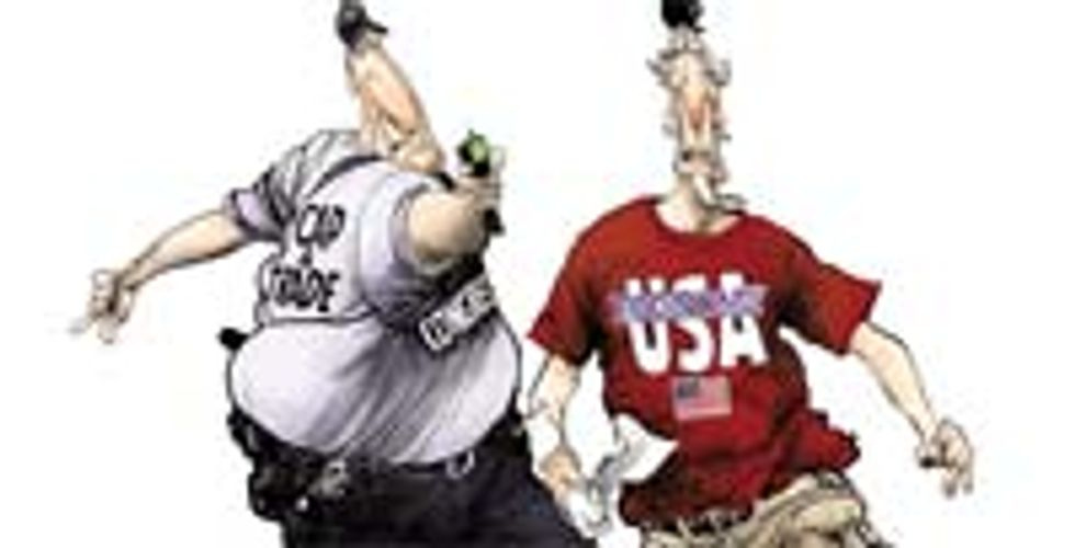 Still, nobody expected things to end quite as unpleasantly as they did: with Uncle Sam and his Euro-bud getting so fucked up on moonshine that they got into a vicious fight that left both so injured that doctors had only one desperate recourse to save them: combining the non-mangled body parts to create a single merged organism. Since this did not entail Human Centipede levels of horror, a jaded populace mostly ignored it, but you have to admit that it sure would be traumatic to wake up after a bender to find the be-bereted head of your foreign frenemy permanently attached to your shoulder.