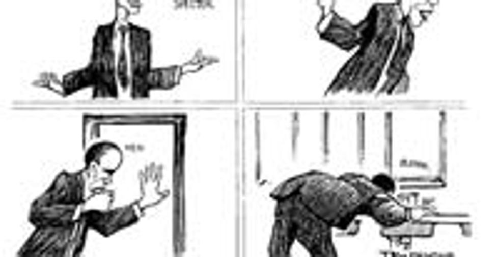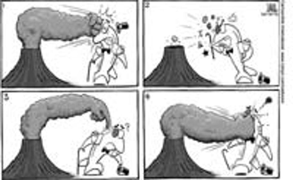 Oh, in case you were wondering, this right here is the greatest political cartoon published in 2010 so far. It is from China, and it features a jet plane, sporting the top hat and cane and bow tie one associates with comical plutocrats and Mr. Peanut, getting punched in the face by a volcano, twice. The panels are numbered, in case you're unsure of the sequence of events.