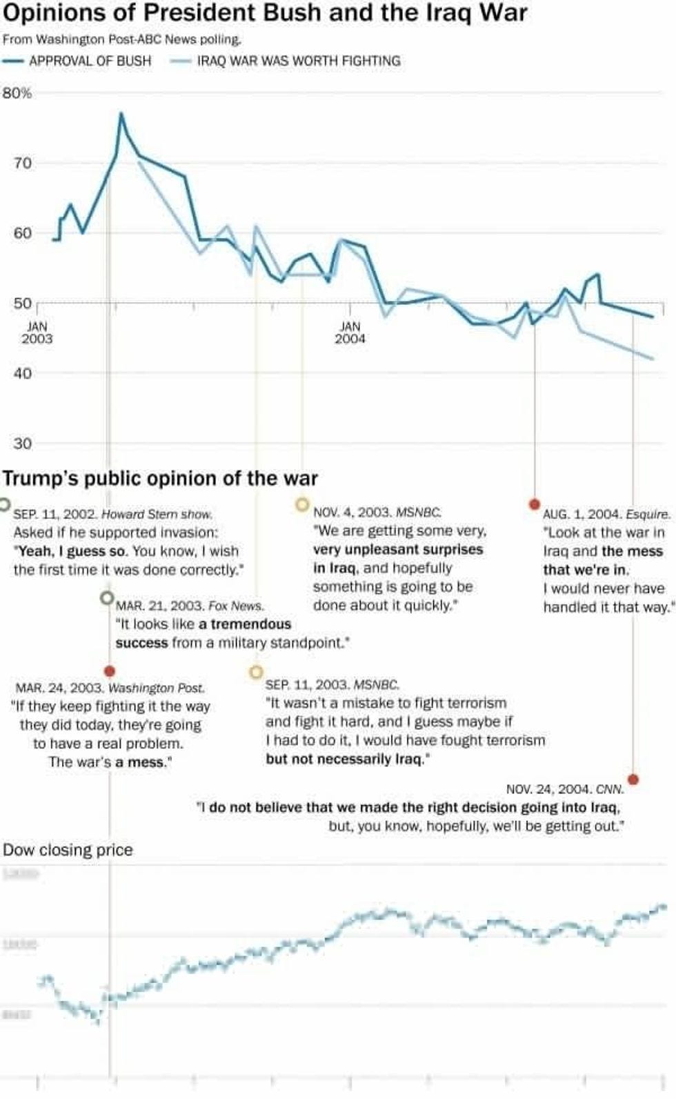 Donald Trump always opposed the Iraq war, even when he was for it. WaPo's Philip Bump posted this fascinating chart of the correlation between public opinion and Trump's evolving opinions on Iraq: