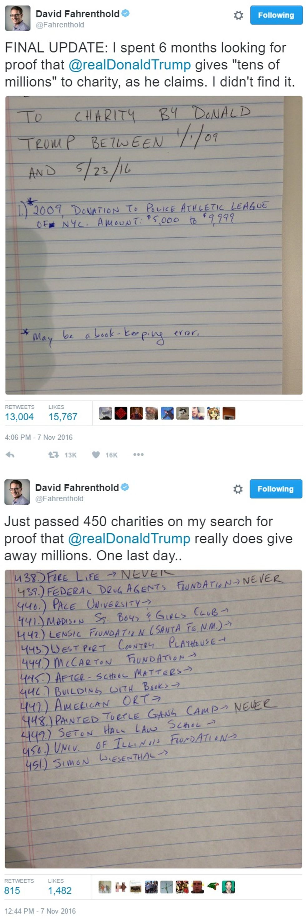 News nerds been going nuts over Washington Post reporter David Fahrenthold's deep dive into Donald Trump's virtually nonexistent charitable giving, mostly accomplished through the most basic, work-intensive investigative technique: Calling up charities that seemed likely to have received some of the "millions and millions" of dollars Trump says he's given to charities over the year, and keeping track of all the charities to which Trump had actually given money out of his own pocket. Fahrenthold's list, on a plain vanilla pad of paper, was an evolving record of nothing there; by the day before the election, he'd called just over 450 charities and only one had acknowledged a gift from Trump: