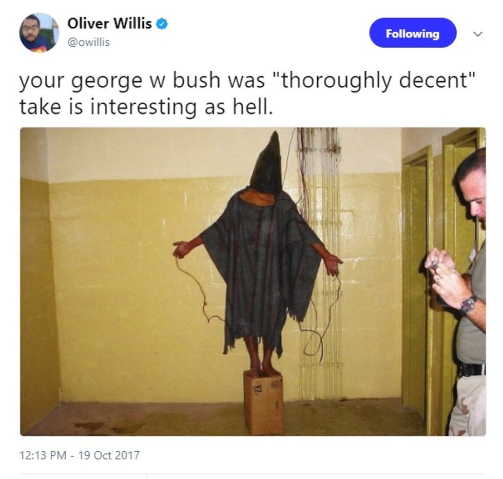 But this speech wasn't for us damn liberals anyway. It was for the 40% of Americans (the Republican ones) who don't hate GWB and who are wondering just what the hell happened to their party when the screeching rageweasels took over. You don't have to love Dubya to recognize that as awful as he was, he was, to turn P.J. O'Rourke's assessment of Hillary Clinton around, "wrong about absolutely everything," but at least he was "wrong within normal parameters." We'd far rather be making fun of a George Bush than a Donald Trump, thanks.