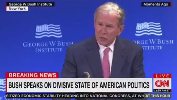 Let's get this straight: George Bush was still a terrible president. But with Donald Trump having in just nine months seized the trophy for "Worst President Ever" (after which he tried to sell it to Russia as a golden samovar), ol' GWB is looking downright tolerable by comparison. Which is why editorials are falling all over themselves to praise W's speech today at the George W. Bush Institute, where he said things in this country are getting damned weird. He never named the current president, but there was plenty that sounded like it just might have something to do with the current occupant of the White House (when he's not off at one of his golf resorts) and his Online Flying Monkey Brigade: