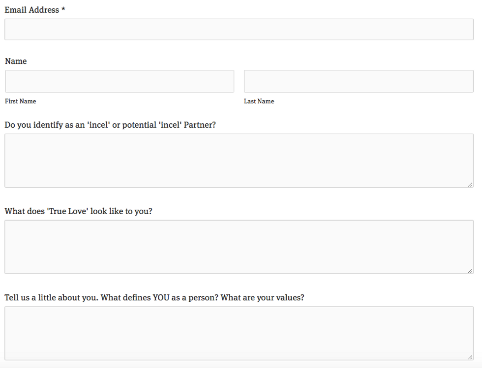 BUT, there is an incel dating site, cleverly titled Date An Incel dot com and seriously, we kinda need to talk about it. Unfortunately for all of us, there aren't profiles of our potential incel suitors, because the site apparently operates in more of a matchmaker service type of way. You just fill out this handy questionnaire, and apparently they contact you with the future love of your life.
