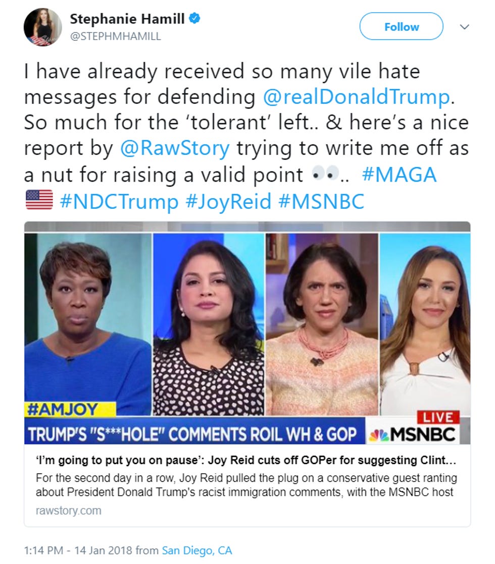 It was early on you see, when Joy Reid put Stephanie Hamill on pause, so she just kept her there in the split screen and made her smile and nod and stew while smarter people like Reid and Jennifer Rubin from the Washington Post kept talking, and when Hamill tried to cut in, Reid was like "Oh, are you somehow under the impression that it is your turn?" What was Hamill going to do, get up and leave? Because that would have made her look like even more of an idiot than she already did, which is hard to imagine for somebody who came in spouting Clinton Foundation conspiracy theories.