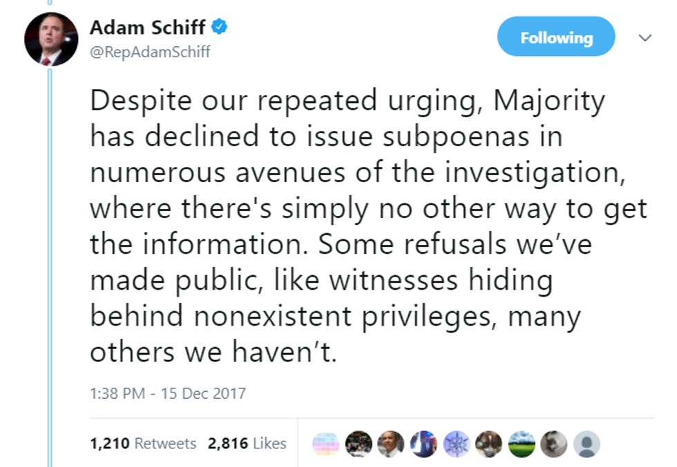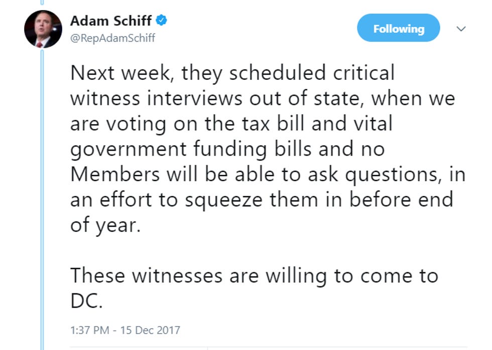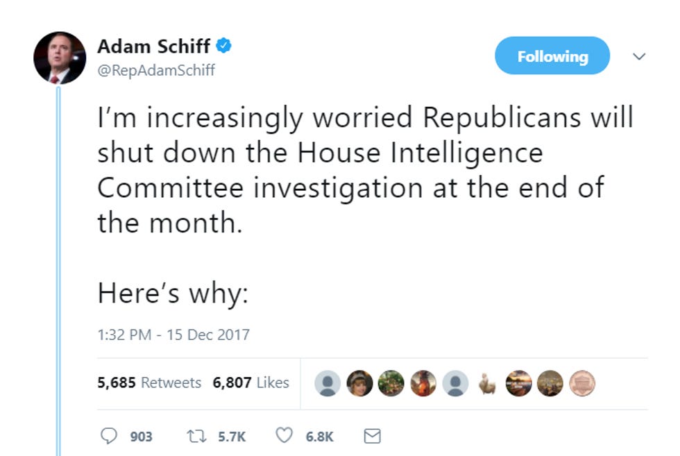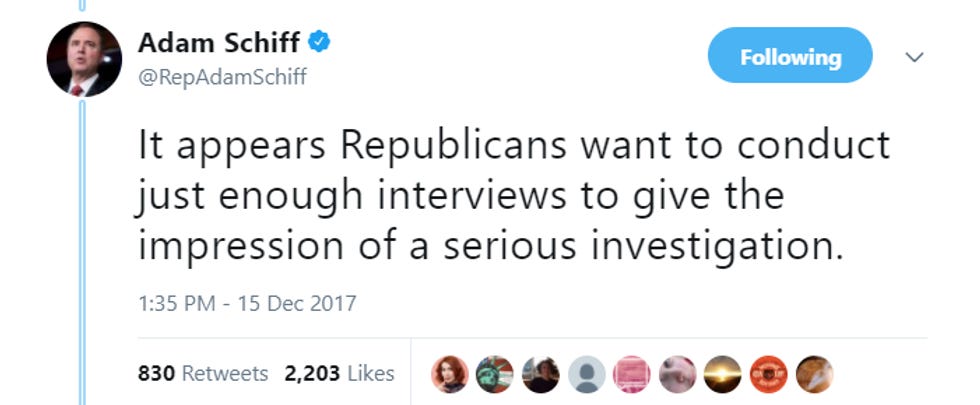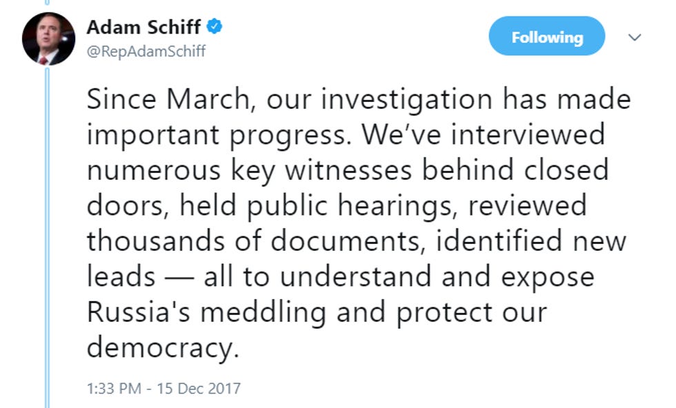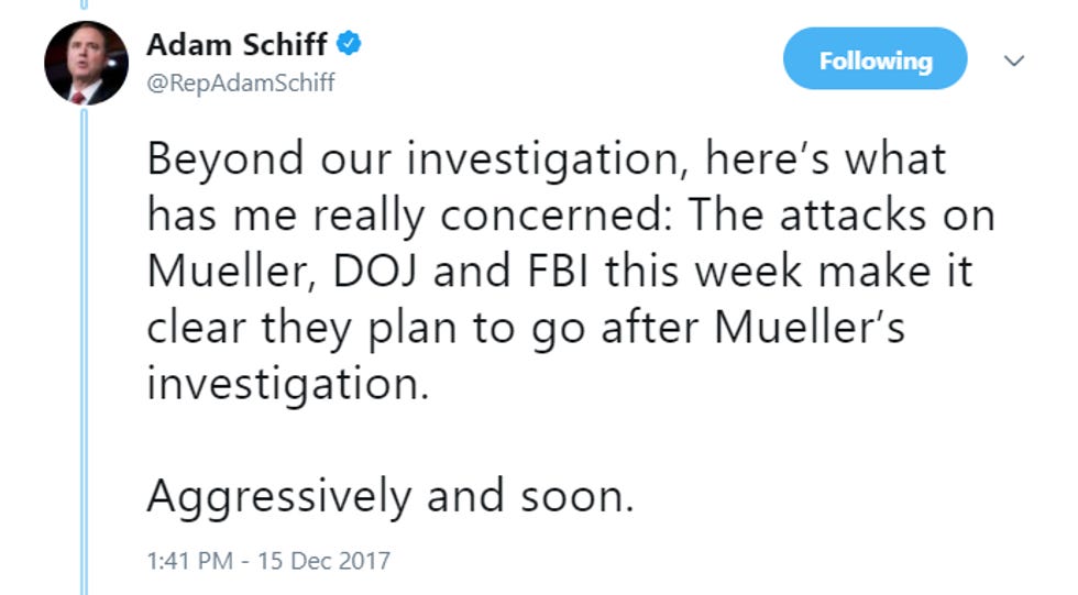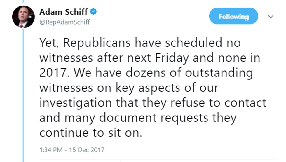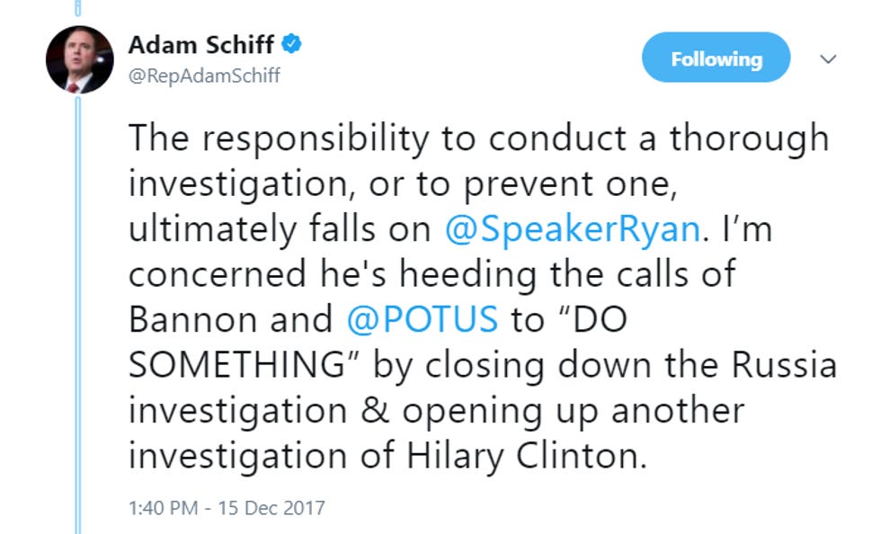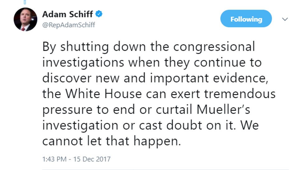 But instead we must redirect your attention to the tweeting newsfeed of Rep. Adam Schiff, ranking member on the House Intelligence Committee, who has been one of the absolute HEROES of trying to save American democracy from the band of Russian intelligence asset thugs who currently control the US and A. Schiff is hitting the "OH FUCK!" button, and his warnings are that he thinks the Mueller investigation is in more danger than we even knew, and also that he thinks the GOP dumpster fires who run his committee (Devin Nunes, Mike Conaway, Trey Gowdy) are going to shut down their investigation, such as it is, by the New Year.