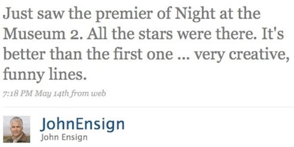 Commenter and amateur vetter "SwanSwanH" makes this shocking discovery on thatother thread about how John Ensign considers it his Constitutional duty to probe Sonia Sotomayor for any symptoms of Idiot Cancer. It appears that less than two weeks ago, Sen. Ensign twatted that "Night At The Museum 2" was "better than the first one," a declaration wrought with symptoms of Idiot Cancer. [ Twitter ]