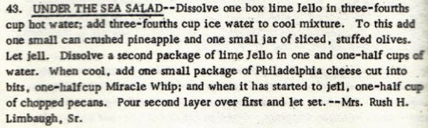 That, Wonkados, is what a young Rush Limbaugh ate for a treat: jello with pineapple and stuffed olives. AND MIRACLE WHIP ON TOP. Not Cool Whip -- that lovely fake whipped cream in a tub -- but Miracle Whip, the mayonnaise blended with salad dressing.