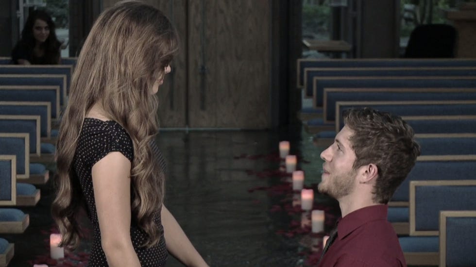 They're "scouting a location" for ... ok we totally didn't pay attention to what they're scouting for. Anyway, the perfect location turns out to be where Jessa got engaged to Ben, who does not appear to have really thoroughly combed his hair for the blessed occasion.