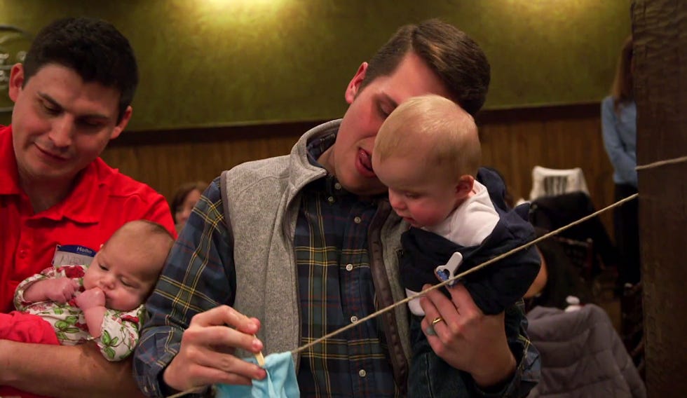 Who on earth thinks this is a game? It's like they decided the adults would enjoy pretending to vacuum or answer phones at an imaginary office. People do not generally find hanging laundry entertaining, even in the service of celebrating the upcoming birth of yet another one of these type of people. And then of course we close out with a prayer where Kristen's creepy dad creepy looms over them and prays.