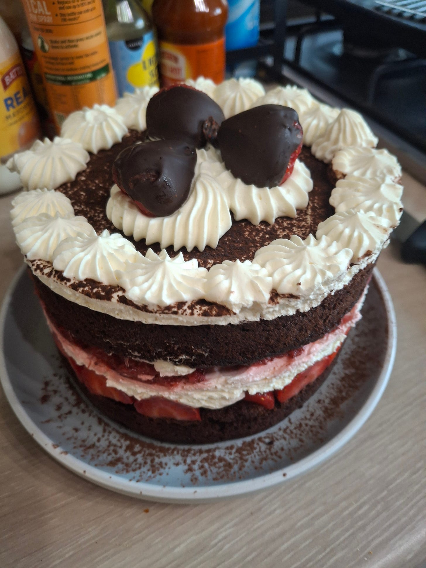 Remove the cake and the strawberries from the fridge and carefully place the chocolate coated strawberries in the centre of the cake.