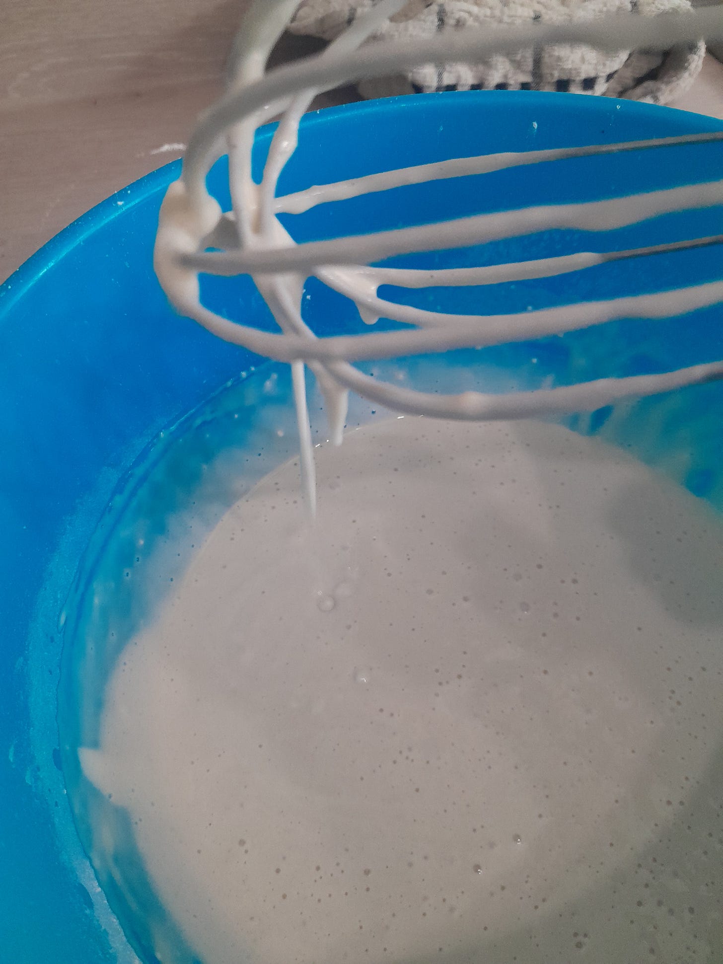 Mix your dry ingredients in your large mixing bowl and make a well in the centre. Now add your yeast mixture and your water. Using your whisk, start in the centre and mix in a circular motion, moving outwards, until the batter is well combined. You should end up with a smooth batter with the consistency of heavy cream.