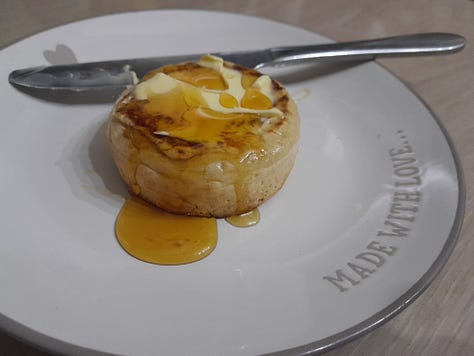 There is a lot of debate as to the origins of the crumpet; Scotland and Wales both lay claim to it, however the first mention of a crumpet in written records dates back to 1382 and the writings of one John Wycliffe, a theologian and Yorkshireman. This mention of a crumpet bears little resemblance to the crumpets of today — it was in fact a cake that had curled at the edges whilst cooking, or “crumped.” So more of a baking accident than a delicious treat. It was the discovery of the capabilities of potassium carbonate (baking soda) as a raising agent for cakes during the Victorian period that led to the modern crumpet, a thick batter cake which is cooked on the stove top. These delicious treats are full of tiny tunnels as a result of the carbon dioxide produced by both the baking powder and yeast during the cooking process. The carbon dioxide forms bubbles which burst and, as the batter sets, form the tunnels which make a hot crumpet the perfect vehicle for delivering a hefty dose of butter straight to your hungry mouth. They can also be topped with jam/jelly, honey, golden syrup, or even cheese. As a small child I used to enjoy having them topped with Heinz baked beans as a lunch or light supper.
