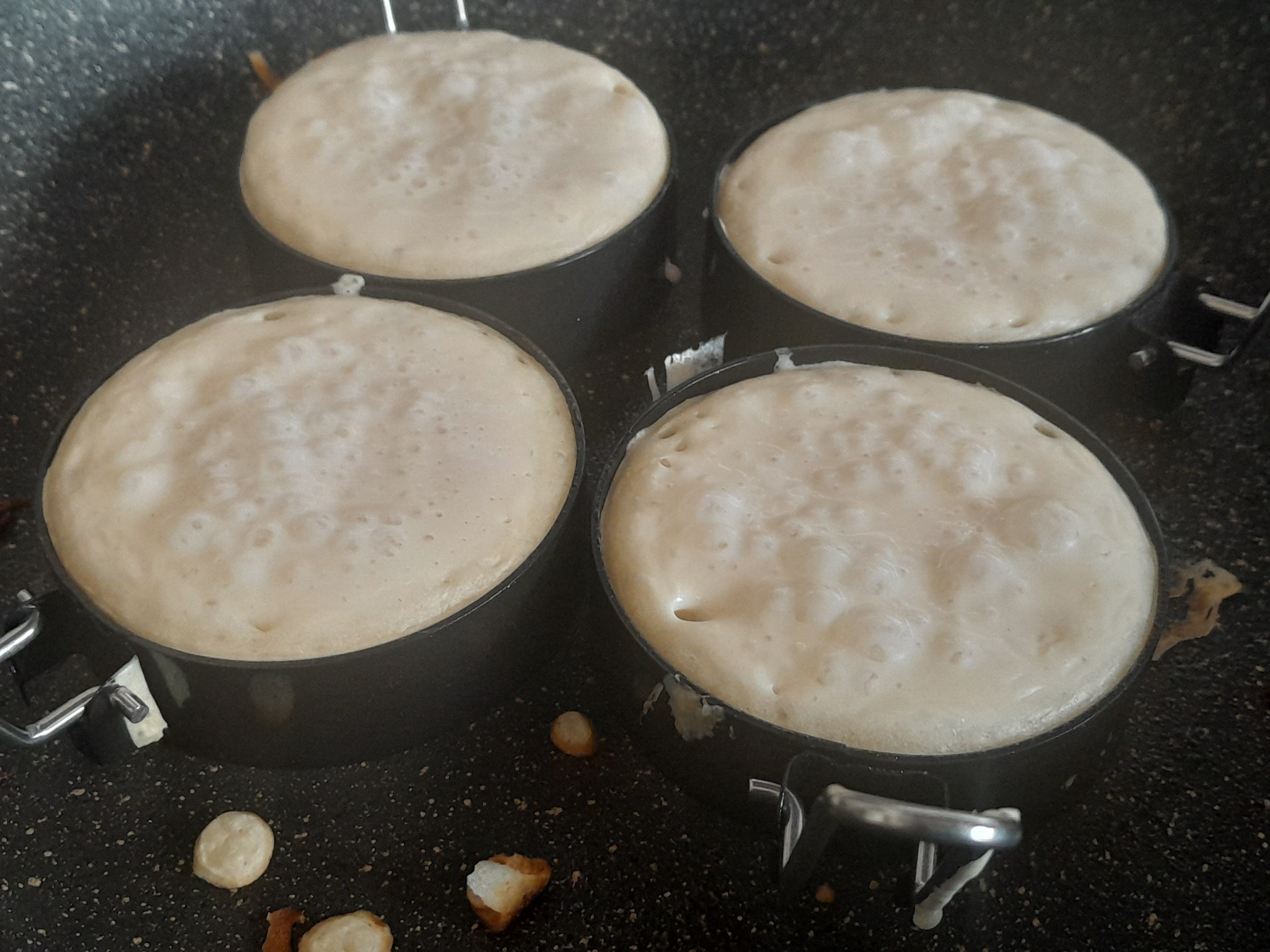 Brush your frying pan and crumpet rings with a little oil and pre-heat your frying pan on a medium heat. Place the crumpet rings into the pan and spoon in your batter until the rings are just over ¾ full. Leave the batter to cook for roughly 5 minutes, or until the crumpets are set enough that the bubbles leave holes when they burst. Now carefully remove your crumpet from the ring and flip it over, continue to cook for another 2-3 minutes. Remove from the pan and set aside. Now re-oil your pan and crumpet rings and repeat until you have used up all the batter.