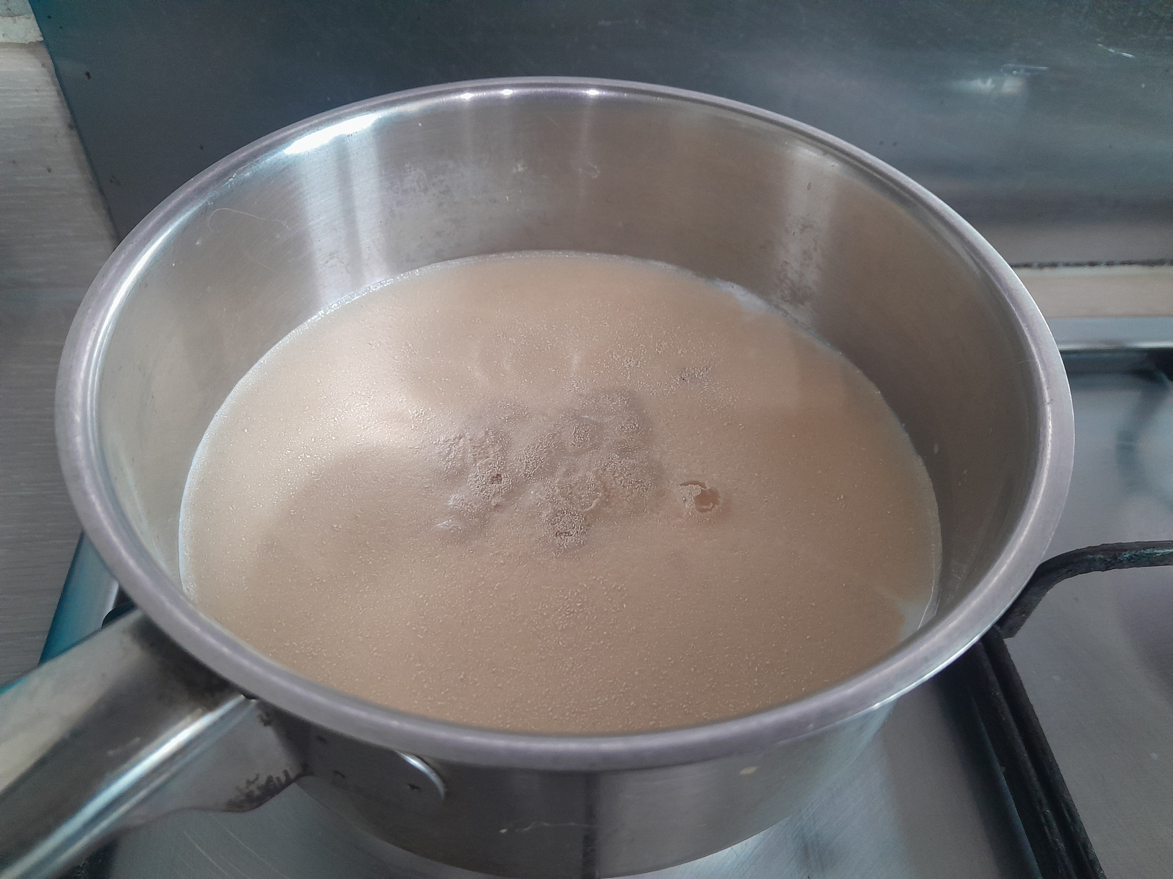 Gently warm your milk in your small saucepan. You want it to be comfortably warm if you dip your finger into it. Turn off the heat and add your yeast, then leave it for 15 minutes. When you return to the pan you should notice a nice, thick foam. This is perfect as it means your yeast is now producing lots of carbon dioxide.