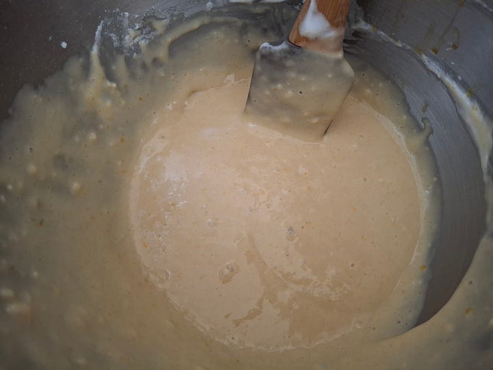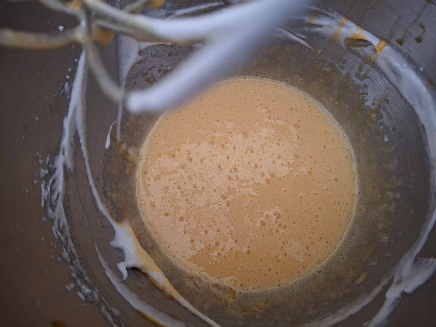 In another bowl, mix your egg yolks (4) with the remaining sugar (50g) and vanilla essence (1 tbsp) until the mixture is pale and foamy, this should take about 2 minutes with an electric whisk. Add the flour (200g), baking soda (1 tsp) and milk (100 ml) to the egg yolk mix and use a spatula to fold them together.