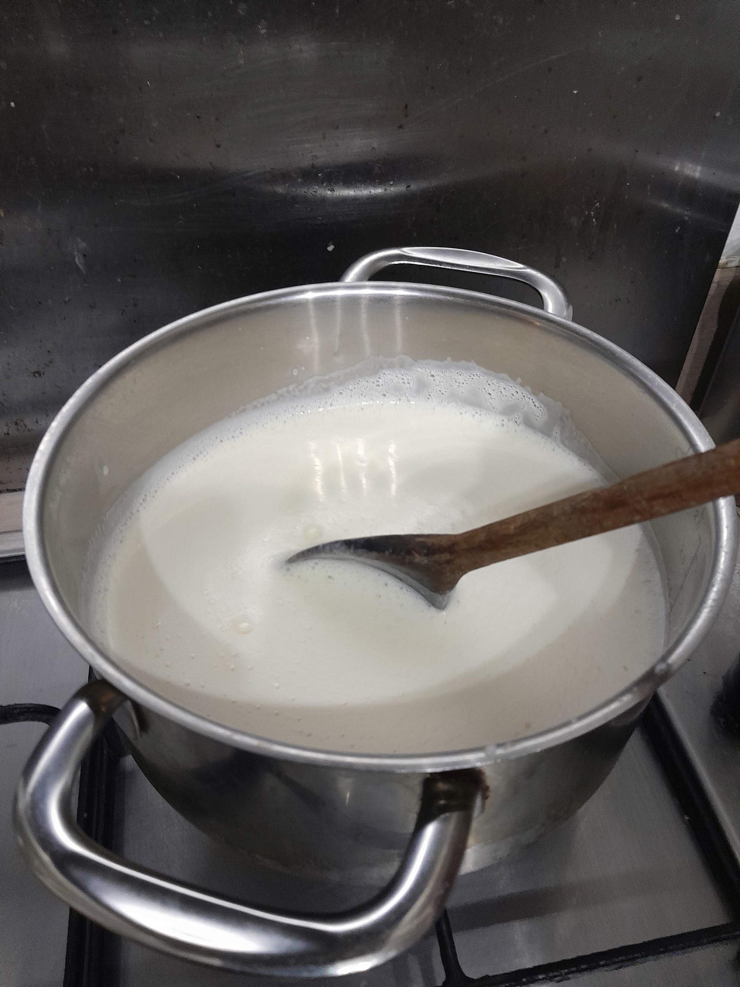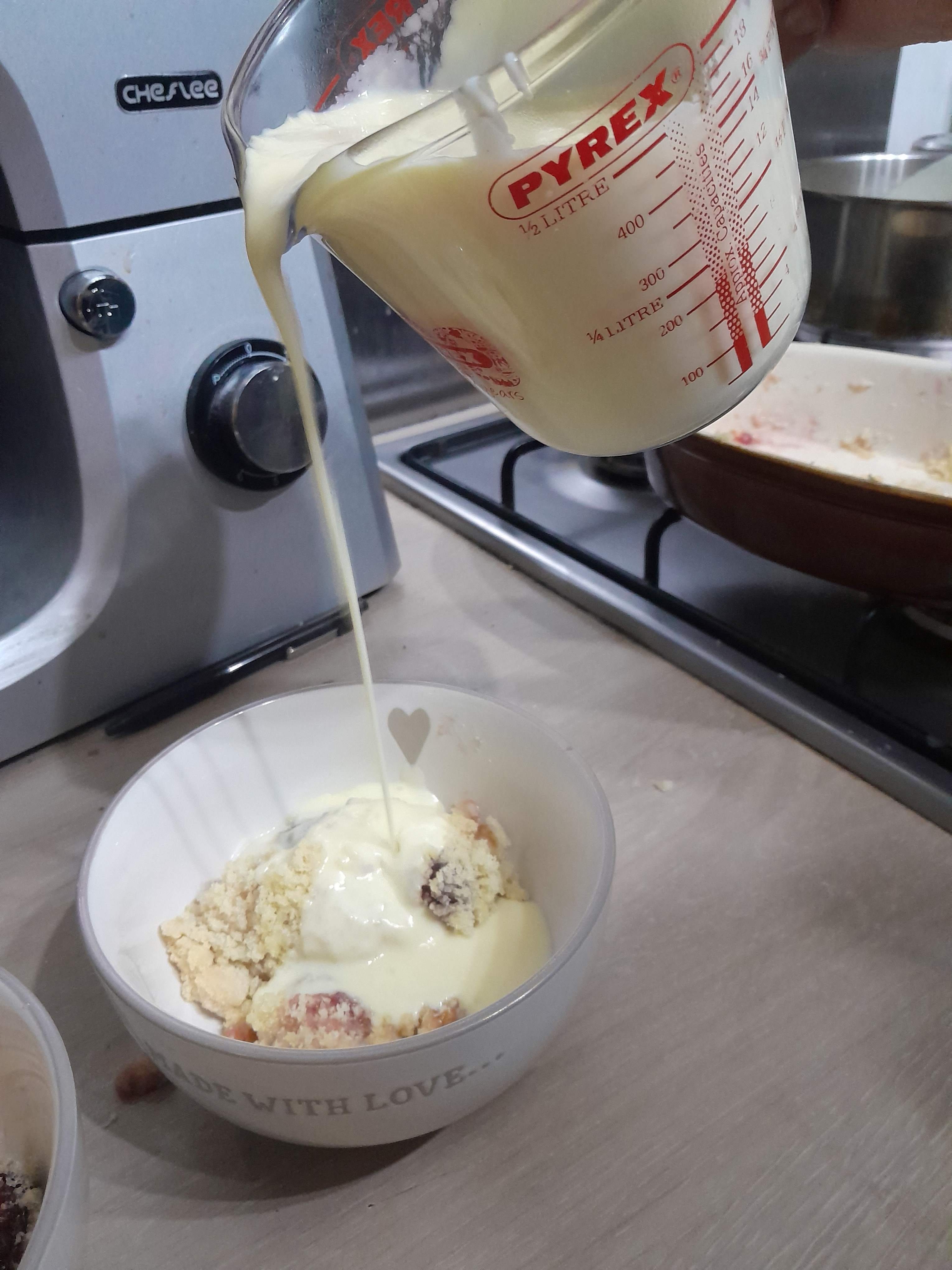 Whilst your crumble is baking start your custard; in your saucepan heat the milk and cream until just under boiling temperature. In your mixing bowl whisk your egg yolks, cornflour, and sugar