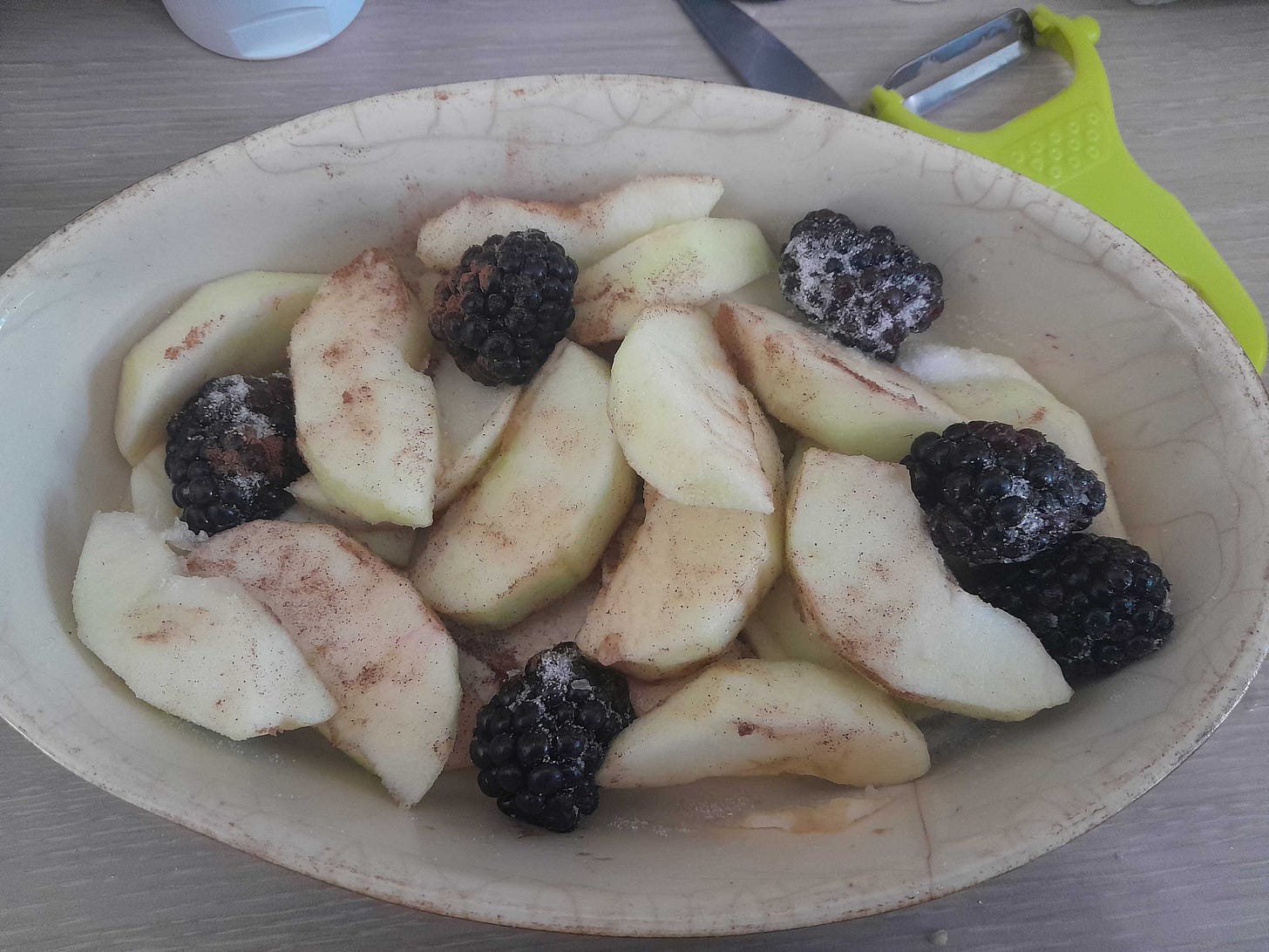 Peel and core your apples and cut into slices of around ½ inch thickness. Layer your apple slices in the bottom of your pie dish and mix in your blackberries, top with the sugar and any spices you are using. There is no need to stew your fruit filling, you want your fruit to maintain some of its shape and texture.