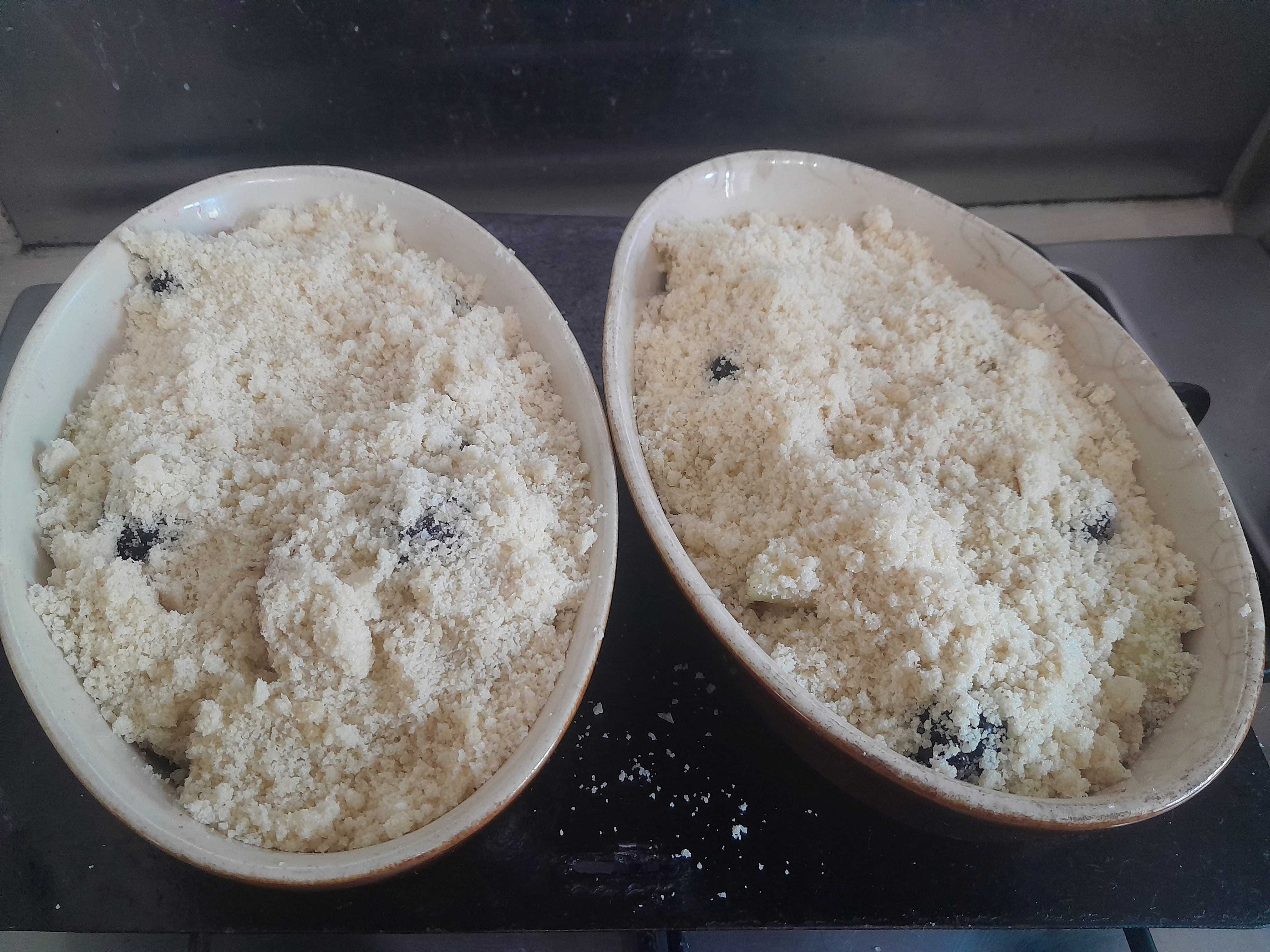 Spread your crumble mixture over the top and place on the top shelf of your oven for 35-40 minutes, or until the crumble starts to turn golden brown in colour.