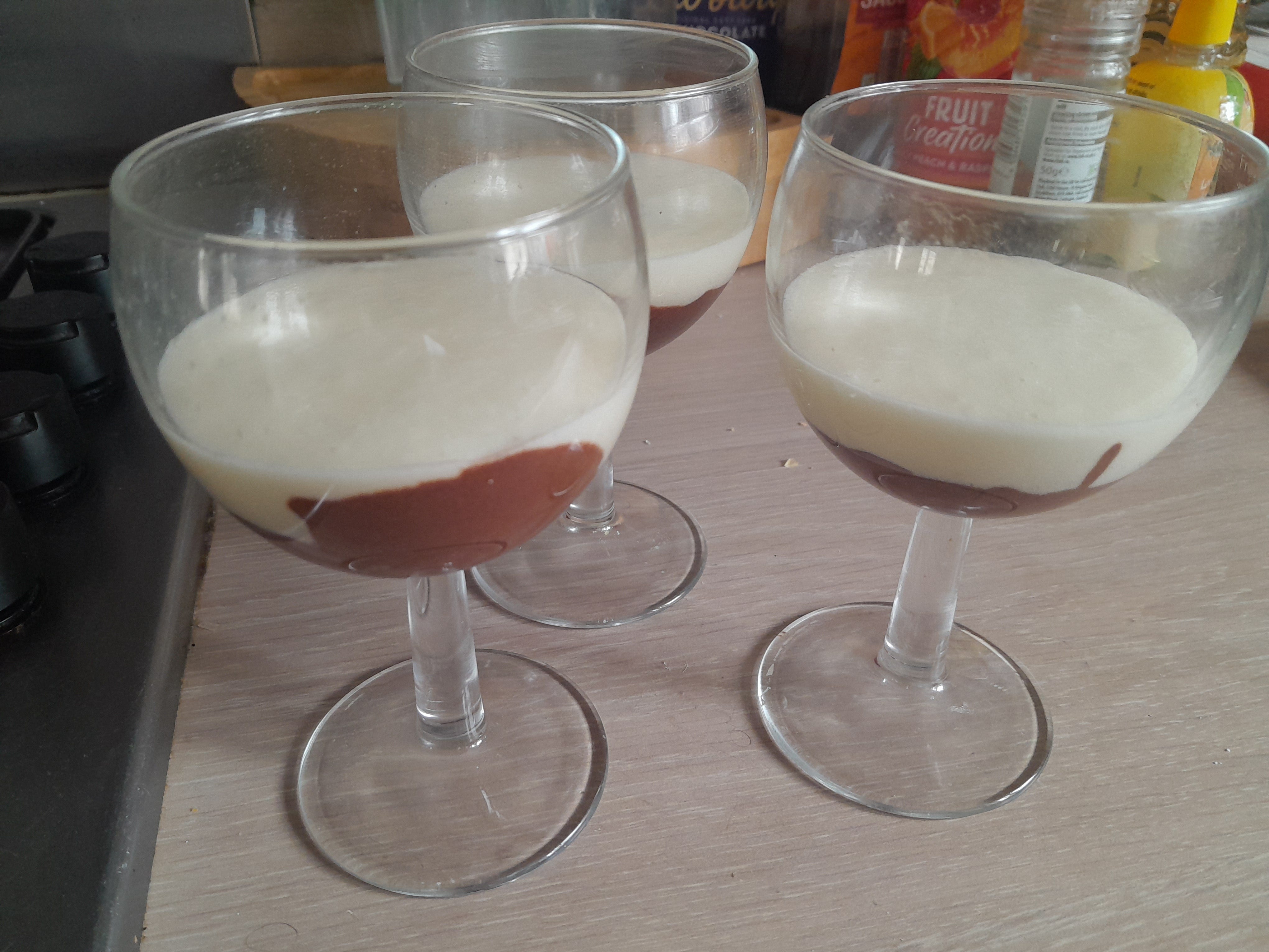 Take your dessert glasses (wine glasses work beautifully if you don’t have designated dessert glasses), and spoon in your white and dark mousse.
