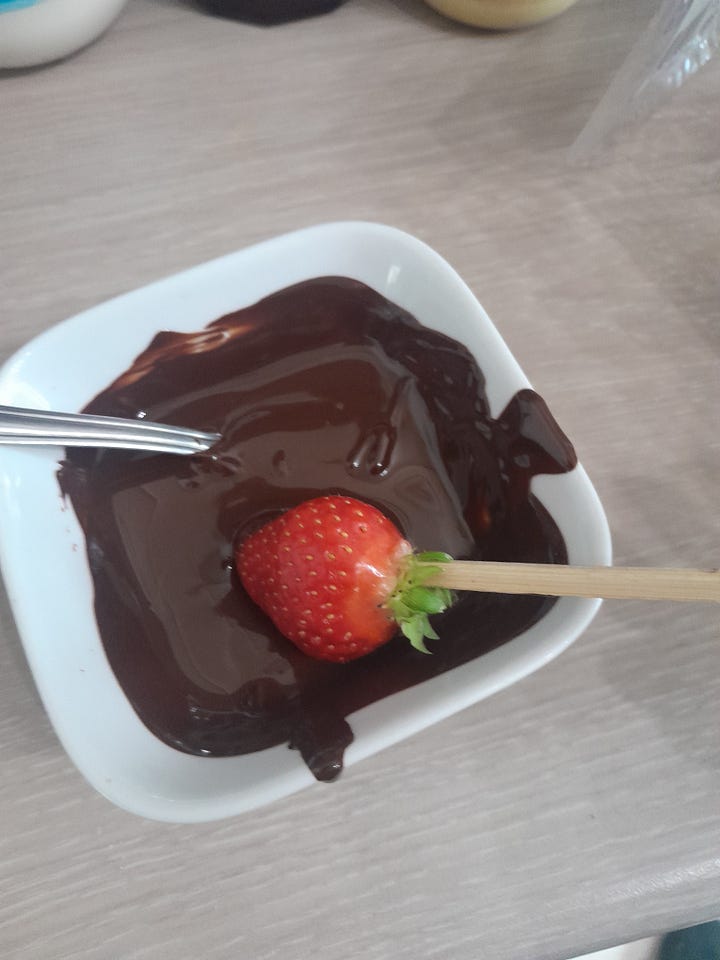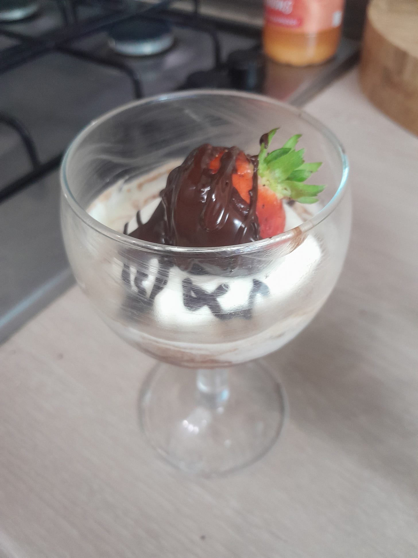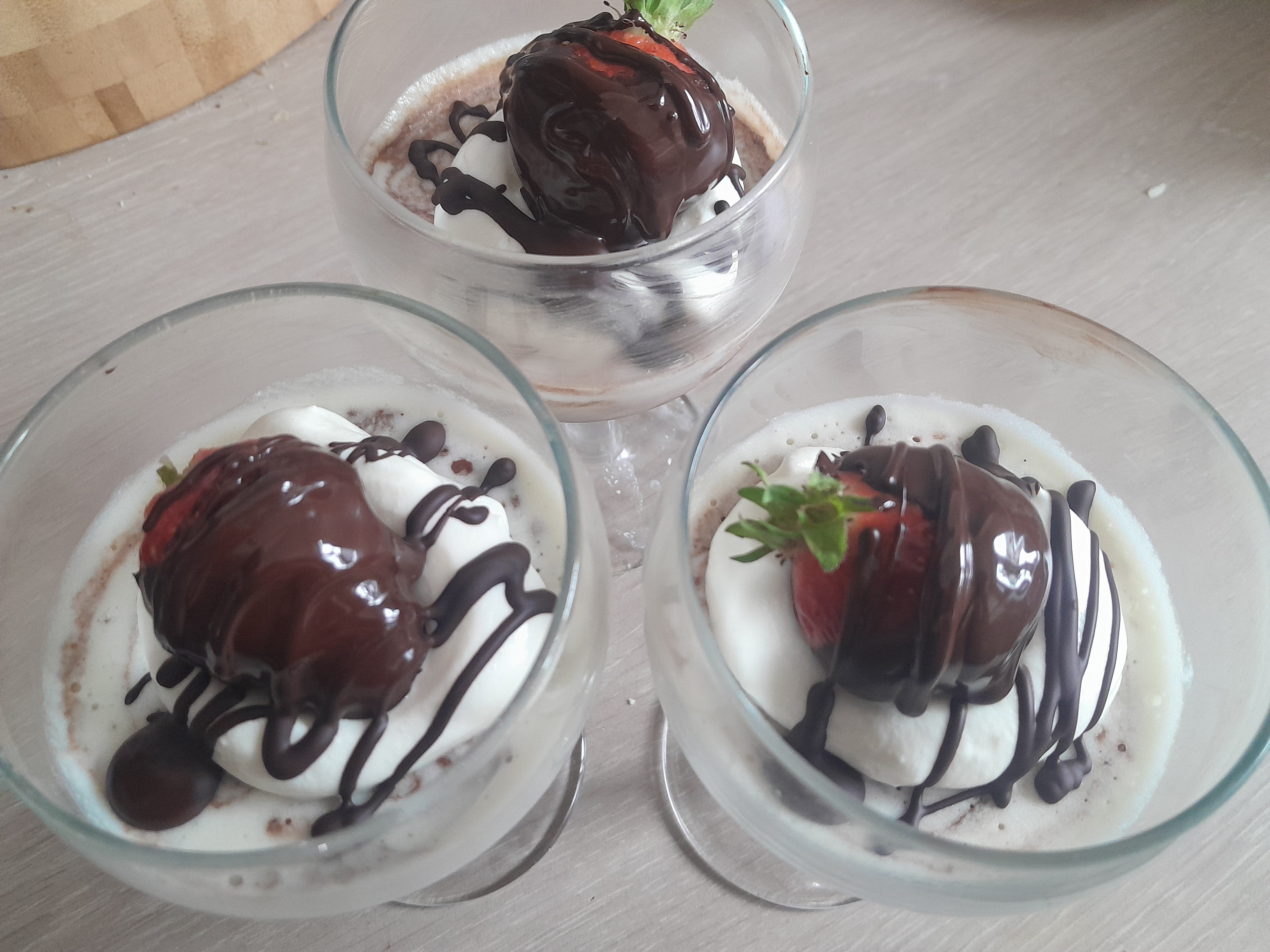 Take your set mousse and top with a tablespoon of half fat crème fraiche (or use whipped cream, if you’re feeling naughty). Place the chocolate dipped strawberries on top, and drizzle with any remaining chocolate.