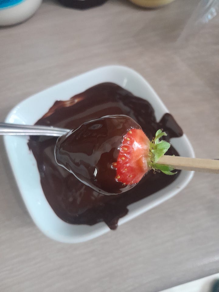 Meanwhile, melt your remaining dark chocolate and dip your strawberries in it. I find using a skewer to pierce through the stem of the strawberry so that I can roll the strawberry in the chocolate to be a very effective way of ensuring good coverage.