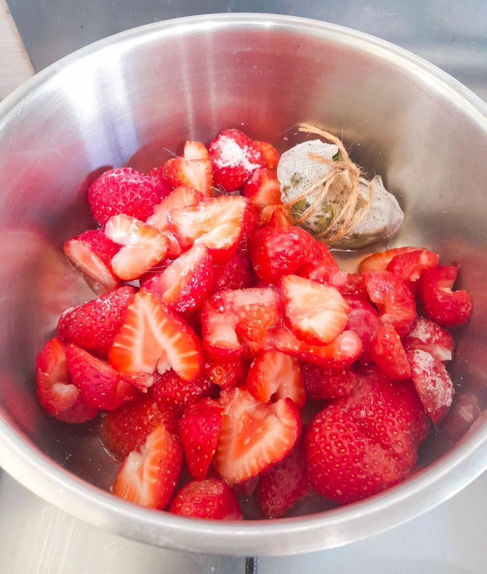 Now take your compote ingredients, cut your strawberries into cubes and place these into the pan with the sugar and lemon juice.