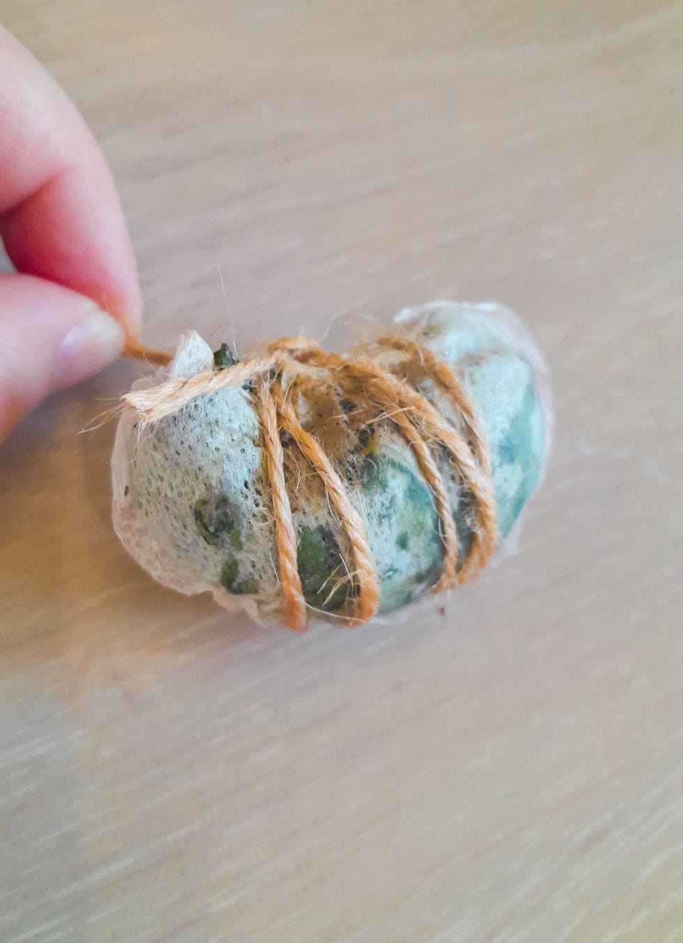 Take your basil leaves and squash them into a ball that will fit into your tea strainer/muslin bag; alternatively, cut open a tea bag and empty it out, fill the bag with the basil leaves and then use the string to tie it closed (wrap it around the bag 2 or 3 times and then tie it off).