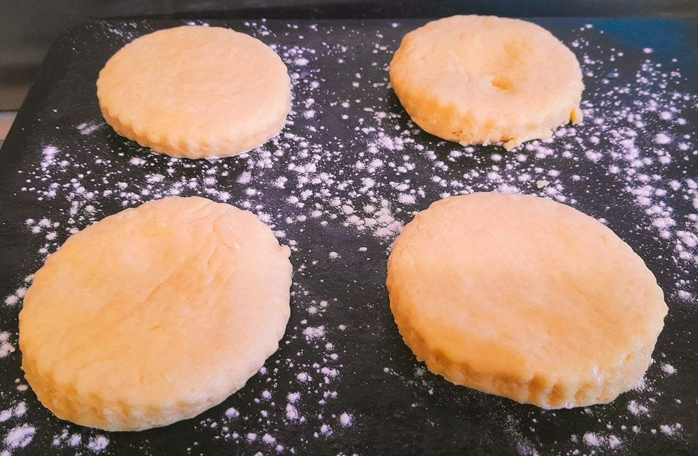 Lightly dust your baking tray with flour and then take your pastry cutter and cut your dough into eight circles; you will need to re-roll the dough at least once. Place the shortcakes onto your baking tray and glaze with a bit of beaten egg.