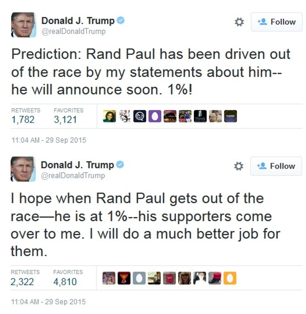 On top of the sudden disappearance of one of his super PACs, Paul also had to contend with Donald Trump twitting him on the Tweeter , calling attention to his poor polling -- way down from earlier in the campaign -- and generously offering to steal away Paul's supporters, even if they have to crowd into more than one car:
