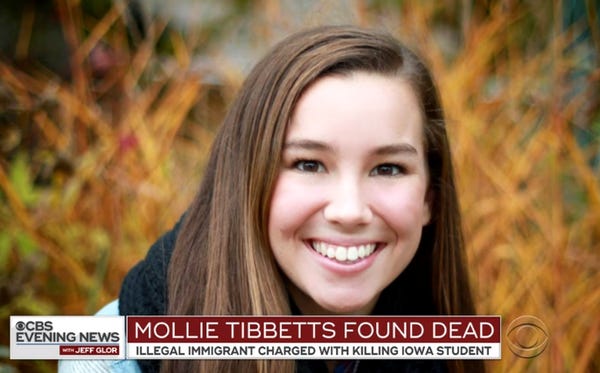 Tibbetts was a 20-year-old college student when she was murdered, and Iowa authorities say the suspect, Cristhian Bahena Rivera, is an undocumented immigrant, though his lawyer says he was working in Iowa legally. It was a brutal crime, and if found guilty, the suspect should rot in prison. We of course send our deepest sympathies to Tibbetts's family and friends.