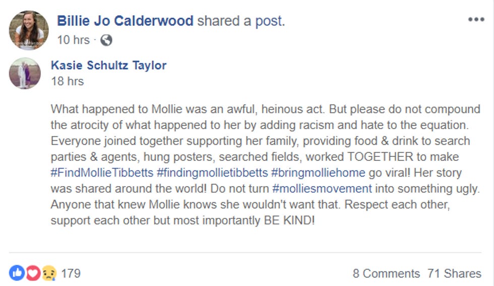 Then Mollie Tibbetts's aunt Billie Jo Calderwood posted this on Facebook: