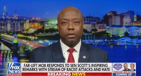 It's usually a very bad sign if you're a Black person only white people can tolerate, but Scott doesn't seem to care. He took a victory lap on Fox News yesterday, where he received head rubs from white hosts who regularly smear Black people. They nodded sympathetically when he complained about his personal experience with racism, which is quite the twist. But Scott is selling a narrative where Kamala Harris is racist but Marjorie Taylor Greene is not. Fox can dig that.