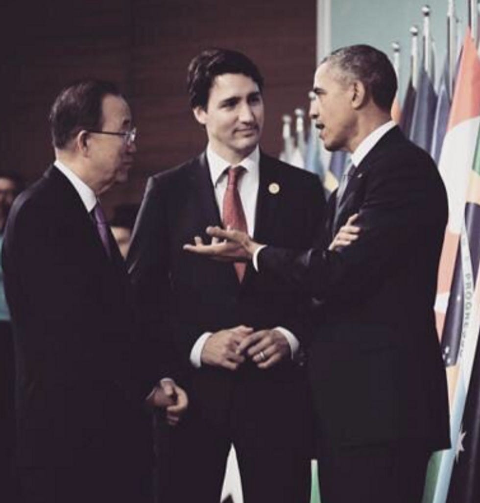 Aw shucks, we were wondering how you were going to bring him up, since you ALWAYS ask about him in American presidential debate preview posts. OK fine, here is a picture of Trudeau gazing with sweet sex in his eyes at your president Barry Barack Obummer, while UN Secretary-General Ban Ki-Moon looks on approvingly: