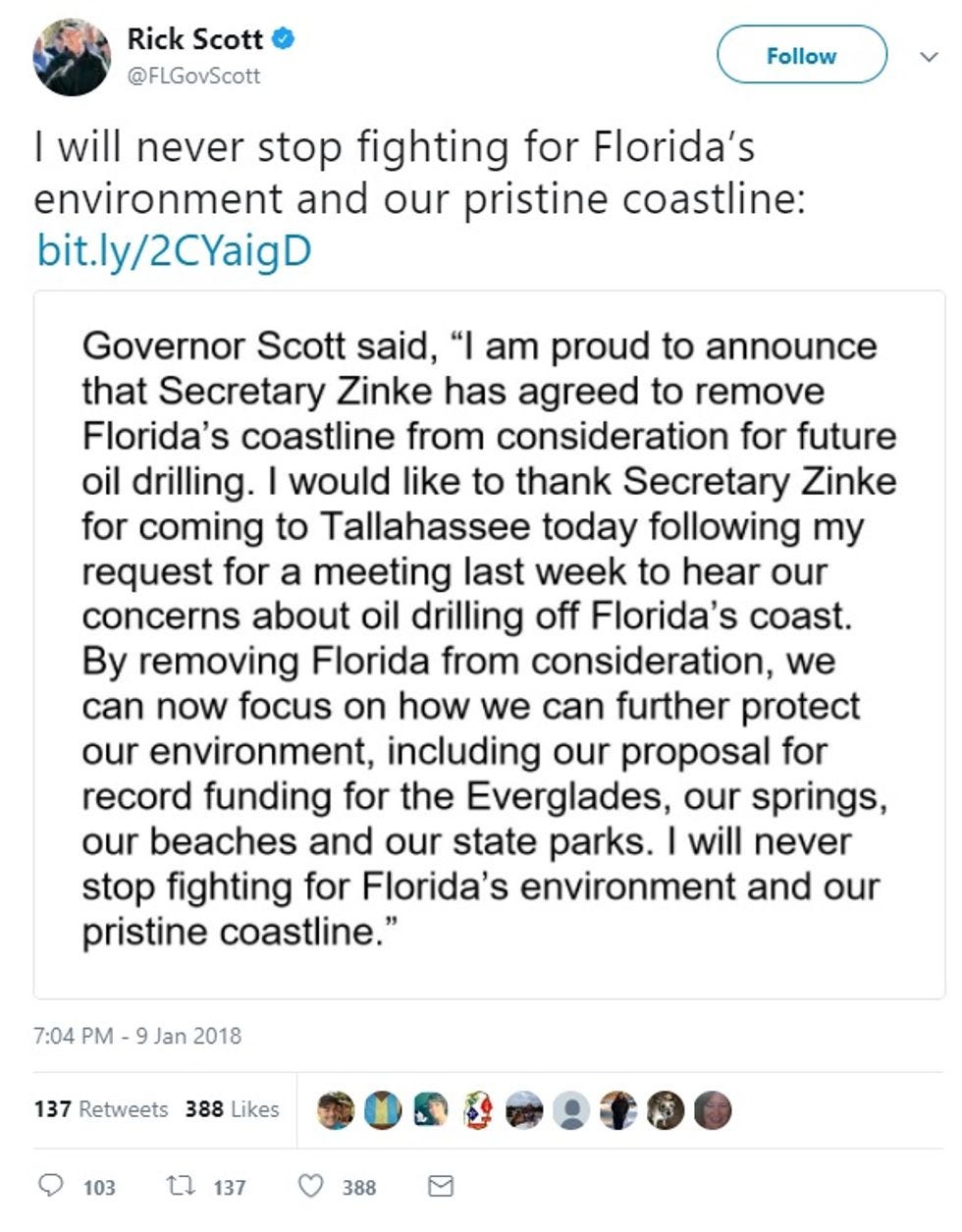 See! He's gonna protect Florida's pristine coastline, the Everglades, the state parks, and Florida's environment like a BOSS. Or like a tool of Big Agribusiness, as Carl Hiaasen likes to remind us. Scott may tweet the right words, but last year, for instance, Scott blocked efforts to reduce the acreage of sugar plantations south of Lake Okeechobee that play hell on the environment: