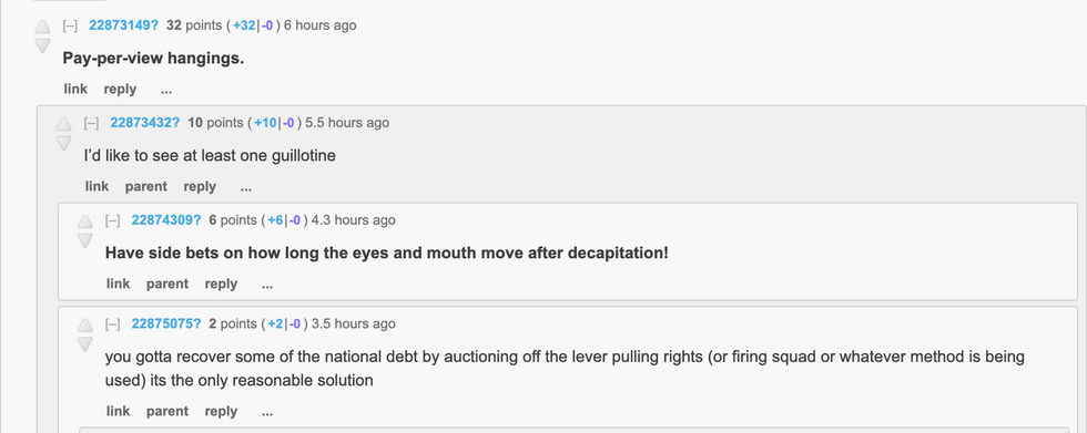 In a thread about this on the Voat QAnon board, they are very, very excited for these mass arrests, the public hangings they hope will go along with them, and the idea of getting to have "side bets on how long the eyes and mouth move after decapitation." They are all very normal US citizens!