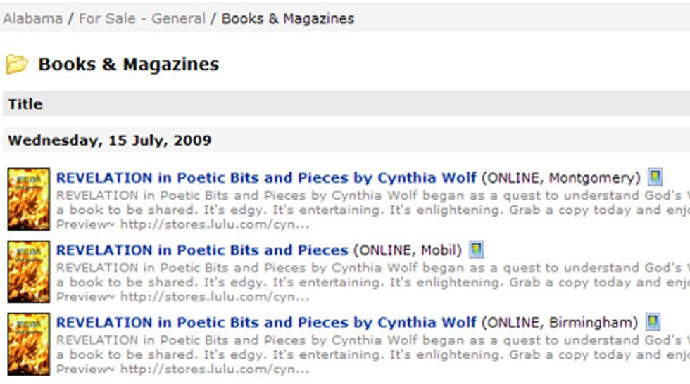 So, finally, true patriots can stop hookin' up with other "str8 males" and concentrate on what's good about America, which is selling shit to fellow Real Americans. Say hello (in English!) to Gipperslist, the kind of place where ... well, jesus, nobody's really using it. Sometimes, it seems like every so-called Republican in the country is a motherfucking RINO leftie, you know? Well hell let's just click the first state -- it's one of the Real American states, too, where slavery is still legal -- and just click the first category in that sea of zeros to actually offer an item for sale. Here, it's the book section! Who says wingnuts caint read good?