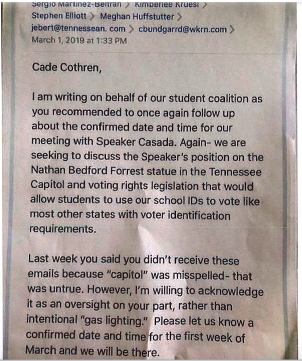 Jones was banned from the Capitol building and order to have no contact, caffeinated or otherwise, with Casada. Later, Nashville District Attorney Glenn Funk filed a motion to revoke the divinity student's bond. The motion claimed Jones had sent an email to Casada's chief of staff, Cade Cothren, which copied Casada and violated the bond conditions. One problem: The photo of the email the DA received was dated March 1, a day after the no-contact order, but Jones had the original because it was, you know, an email. The actual date was February 25th, days prior to the alleged coffee-hurling incident.