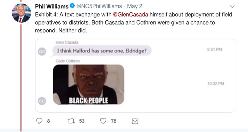 However, attention has now turned to Cothren, which isn't going well for him. A "former acquaintance" sent News Channel 5 text messages from Cothren that include racial slurs and not-so-nice comments about black people. Wow. How can you do this and look Nathan Bedford Forrest in the eye each day?