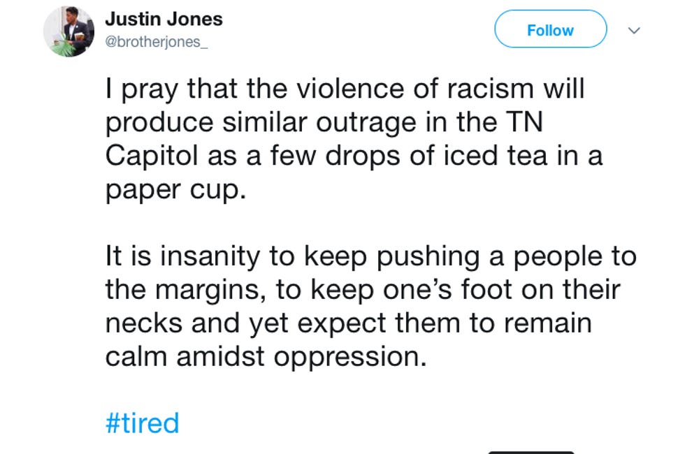 This past March, Vanderbilt University student Justin Jones was arrested for disorderly conduct and misdemeanor assault at the Tennessee state capitol. Authorities claim Jones threw a cup of coffee into an elevator, striking House Speaker Glen Casada and Covington Rep. Debra Moody when Jones and a dozen others showed up to protest the Nathan Bedford Forrest bust in the capitol. Forrest was a Confederate general and an early Klu Klux Klan leader, which is a benign way of saying "traitor and domestic terrorist." Still, coffee is hot (unless you're drinking it cold like a sucker) and shouldn't be tossed at people, even Republicans.