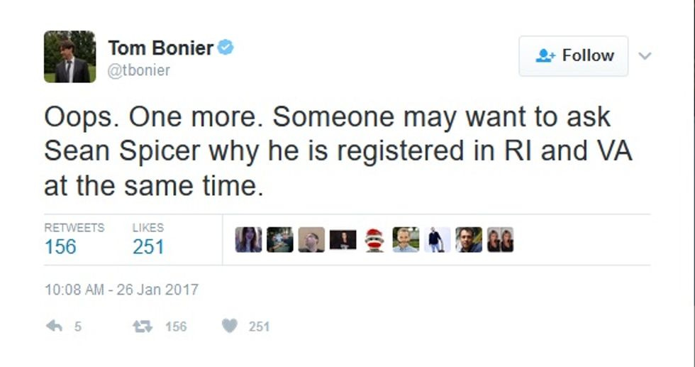Oh, and speaking of Sean Spicer? He's one of those potential voting fraudsters, according to election data specialist Tom Bonier, CEO of campaign data crunching company TargetSmart: