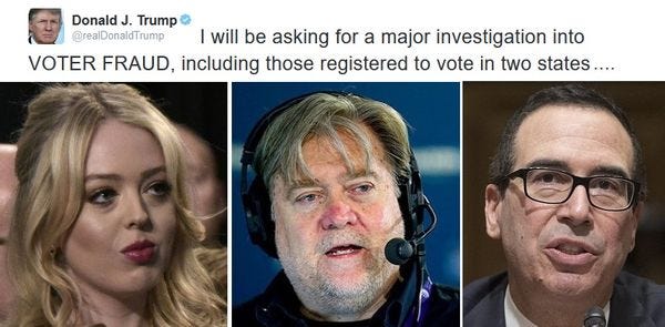 In plain old reality, thanks to the fact that people move and die a lot in a country with about 320 million people living in it, the voting rolls are full of dead people and people who are registered in two states. That latter category would include Tiffany Trump, who's registered in New York and Pennsylvania, Trump's Treasury Secretary nominee Steven Mnuchin, who's registered in New York and California, and Trump's sleazebag strategist Steve Bannon, who until yesterday was registered in both New York and Florida, although the Sarasota County Supervisor of Elections helpfully removed Bannon from voter rolls Wednesday after Bannon's dual registration was reported by a local paper.