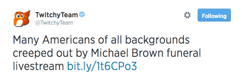 And just in case that is not enough to make you throw up forever -- even though it should be, what the hell is wrong with you? -- we thankfully have Twitchy to inform us that Americans are all , like, gag me with a spoon because Brown's funeral has been livestreamed, with this Twitchtastic headline and a bunch of tweets from total randos because that is what Twitchy does. (Seriously? Nine paid staffers? SERIOUSLY?)
