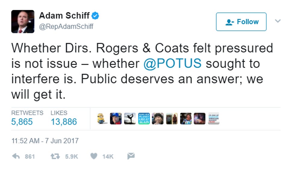 Rep. Adam Schiff, ranking member on the House Intelligence Committee, weighed in on Twitter: