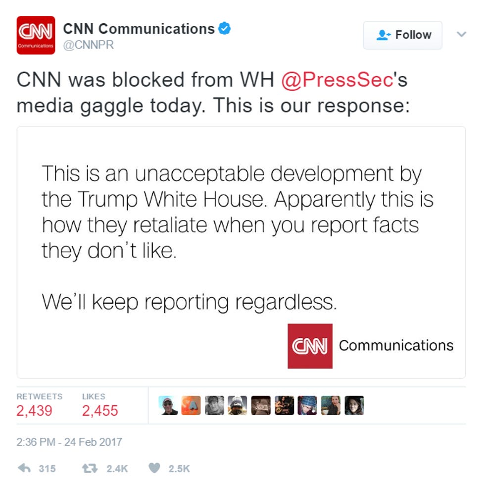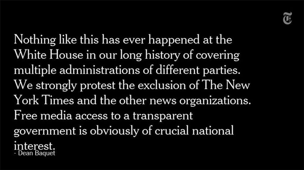 Among the many outlets barred from Spicer's office: CNN, The New York Times, The Hill, Politico, RealClearPolitics, and the Daily News. Others — like the small, conservative One America News Network — were given the nod and allowed in, as well as ABC and NBC, along with the standard rotating "pool" of reporters who are allowed in to every public event.