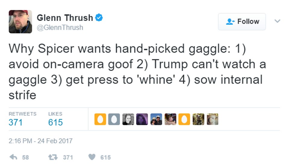 Just a few minutes ago, White House press secretary and Melissa McCarthy impersonator Sean Spicer canceled the daily White House press briefing in favor of a li'l gaggle in his office, off camera, with only certain news outlets allowed in. Friendly outlets. Outlets that do not criticize der Fuehrer ! Take over, New York Daily News :