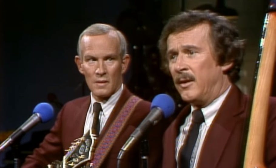 I was only seven years myself when their show “The Smothers Brothers Comedy Hour” was cancelled in a move of monumental corporate cowardice by CBS, so my early TV comedy show memories have more to do with “Laugh In” and “Sonny and Cher,” but I do remember my very Catholic mother saying that “Laugh In” should have been banned like those terrible Smothers Brothers. CBS replaced them with “Hee Haw,” for Crom’s sake.