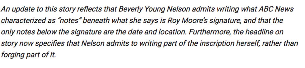 Perhaps ironically, just four days ago Fox News issued a retraction on an article they published claiming that Nelson had forged the yearbook signature, and removed all instances of the word "forgery" from that article.