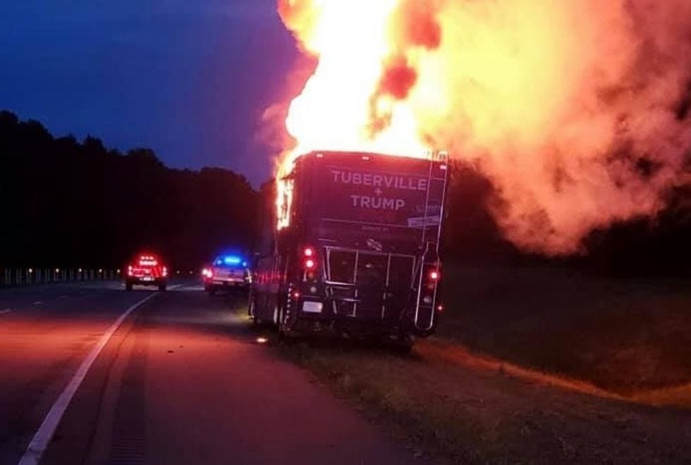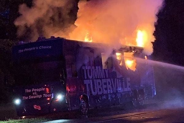 Wednesday evening, the campaign bus for Tommy Tuberville, Donald Trump's preferred candidate in Alabama's GOP primary for the US Senate, burst into flames and melted into a complete loss. The bus was on a test drive after some maintenance, and the driver, the only person aboard, escaped without injury.
