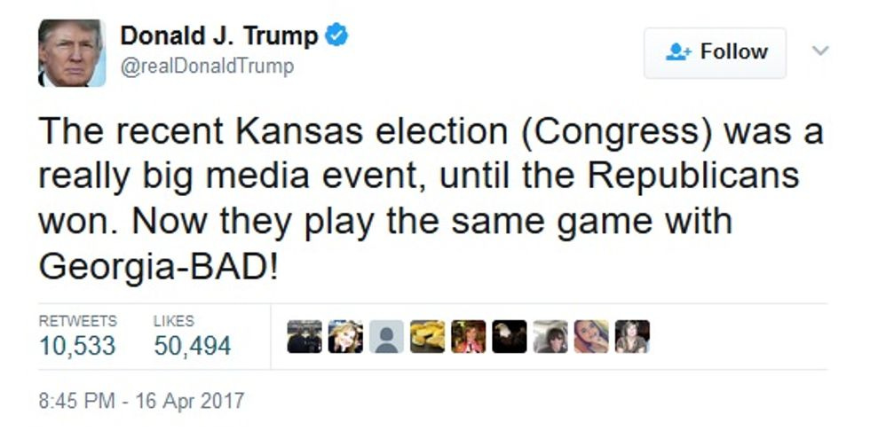 Democrats missed a chance last week to take a House seat in a special election, but this week, things are looking hopeful for the second of four special elections to replace Republicans who left to join the Trump cabinet. In Georgia's sixth district, Democrat Jon Ossoff is currently leading a pack of 18 candidates in an open primary, where if no one wins 50 percent plus one vote tomorrow, the top two candidates regardless of party will have a run-off in June. In the most recent poll, released Friday, Ossoff is at 45%, scary close to an outright win, which would be awfully efficient, wouldn't it? Ossoff's closest competitor, Republican Karen Handel (remember her? she broke that breast cancer foundation), gets 17 percent. If the two go to a runoff, it's likely that gap will narrow a lot with no other candidates to split the vote. Seriously, Georgia Democrats, get out there, win this one tomorrow, and make Donald Trump very angry. Trump is already under the impression that Ossoff isn't running as a Democrat -- Trump wants people to think Ossoff is the Dishonest Media's candidate: