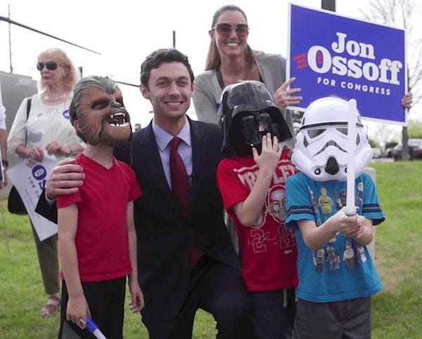 And while you're at it, you can help out too, by sending the proton torpedoes of democracy Ossoff needs to take on the Republicans -- yes, we mean money -- to his ActBlue fundraising page. He's the candidate you're looking for, something something Destiny.